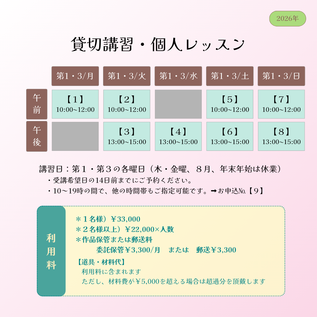六本松教室 貸切、個人レッスン private-lesson 個人または4名以内で貸切利用ができます ご希望に沿った講習をいたしますカリキュラムのオーダーメイドもできます豊かな時間をお過ごしください ご利用可能な時間帯 講習内容 【1回2時間】漆塗り(最低1回)蒔絵(最低1回)金継ぎ(最低1回)漆器修理(最低5回以上)目的やご希望に合わせてアレンジしますご相談ください お問い合せ お申込 受講がお決まりの方は下記リンクのフォームからお申込みください 受講申込
